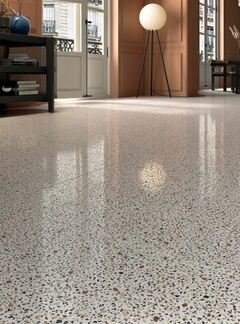 Производство полов такого типа в оригинале выполняется путем внесения в поверхность еще не застывшего бетонного основания каменной крошки с последующей полировкой поверхности. Таким образом получают эффект полированных каменных элементов в матовом бетонном основании.