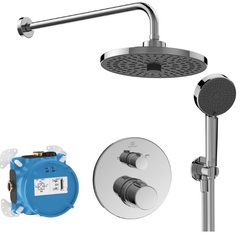 Комплект душевой системы скрытого монтажа немецкой фабрики IDEAL STANDARD с термостатом. Встраиваемая душевая система с тропическим душем состоит из следующих позиций: 2-х режимный верхний душ серии ALU+ из анодированного алюминия диаметром 26 см. Режим: Шелковистый дождь (особо мягкая струя) и Дождь. Переключение осуществляется поворотом ручки, расположенной в центре душа. Верхний душ поворотный, на шарнирном соединении.