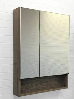 Створки оснащены петлями с плавным закрыванием. Высококачественное зеркальное полотно с амальгамой на основе серебра. Обе боковые створки зеркала открываются наружу. За широкой створкой две горизонтальные полки, за узкой одна. На нижней внешней полке можно расположить невысокие принадлежности для умывания.