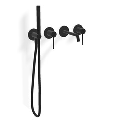 Встраиваемый смеситель для ванны из стены. Длина излива до центра аэратора 176 мм. За счет расположения аэратора под углом струя бьет вперед. Ручной душ и шланг в комплекте. Максимальный расход воды при 3 барах: 22 л/мин