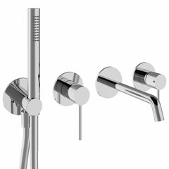 Встраиваемый смеситель для ванны из стены. Длина излива до центра аэратора 176 мм. За счет расположения аэратора под углом струя бьет вперед. Ручной душ и шланг в комплекте. Максимальный расход воды при 3 барах: 22 л/мин