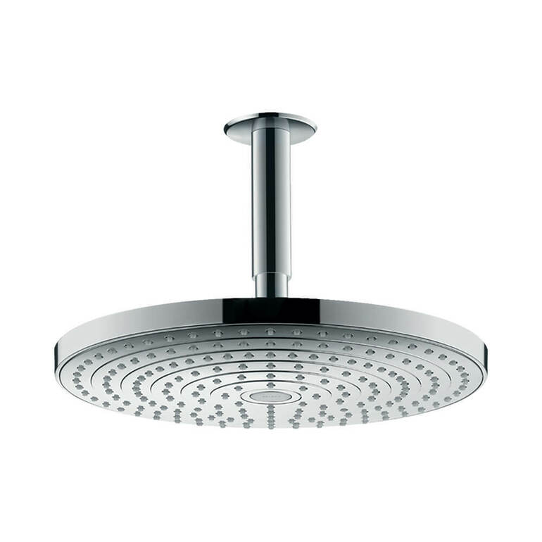 Переключение происходит при помощи кнопки Select на верхнем душе, отдельное подключение воды для второго режима на требуется. Верхний душ сделан из пластика, крепится на шарнирном подсоединении (поворачивается на держателе). Форсунки выполнены из мягкого силикона, устойчивы к отложениям извести и легко чистятся. Размер душа 30 см, максимальный расход воды при 3 барах: 17 л/ мин. Держатель с потолка длиной 10 см в комплекте. Стандартное подключение на вывод с резьбой ½.